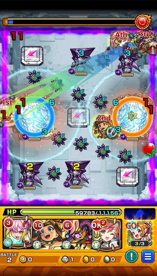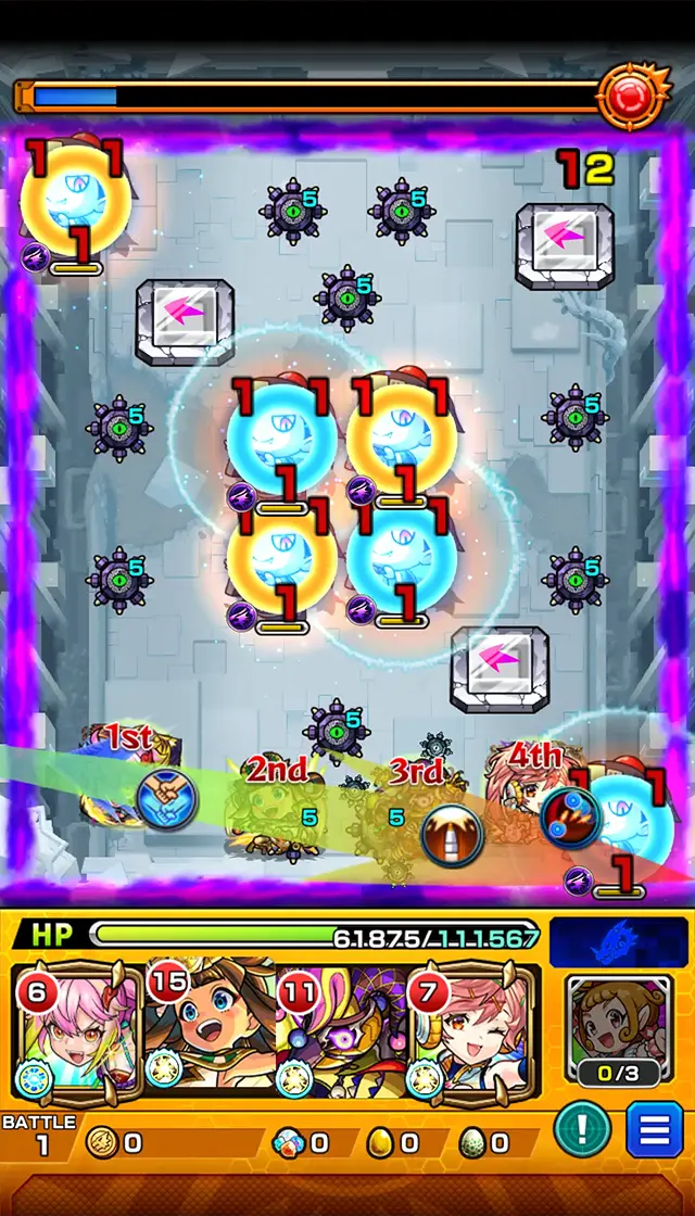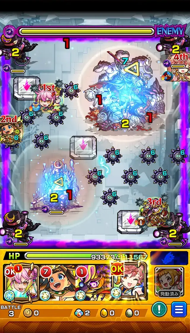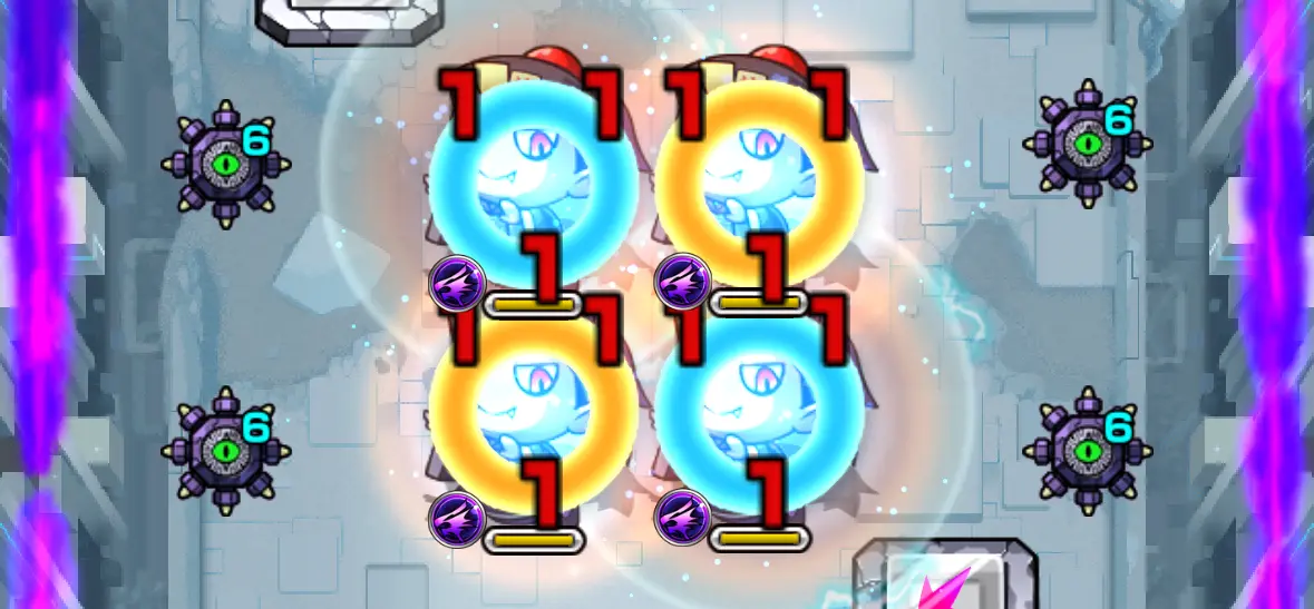 そのため、反射と貫通のキャラを交互に編成し、ランチャーパネルを利用して手番のキャラとパネル上のキャラの両方を動かすことで、同一ターンに反射と貫通の反撃効果をどちらも発動させる必要があります。