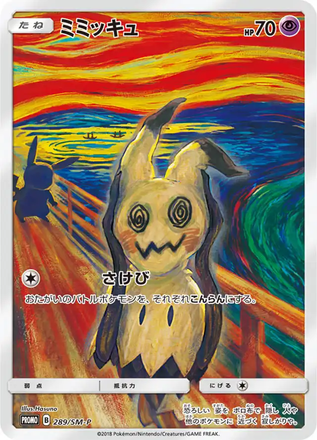 「ミミッキュ」は、ポケモンセンターオンラインと東京都美術館「ムンク展」の二階にある特設ショップで販売されていた「ポケモンカードゲーム ミニカードファイル 叫びピカチュウ/イーブイ」に、付録として封入されていました。