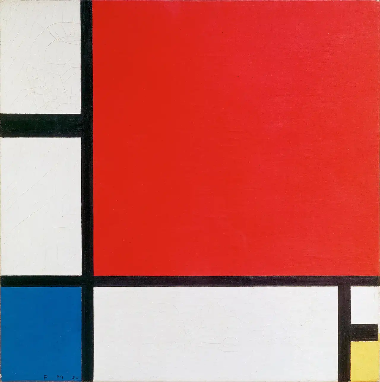「ドーブル《070/095》」の背景に描かれている幾何学模様は、ピート・モンドリアンの抽象絵画「コンポジション」を彷彿とさせます(画像は赤・青・黄のコンポジション)。