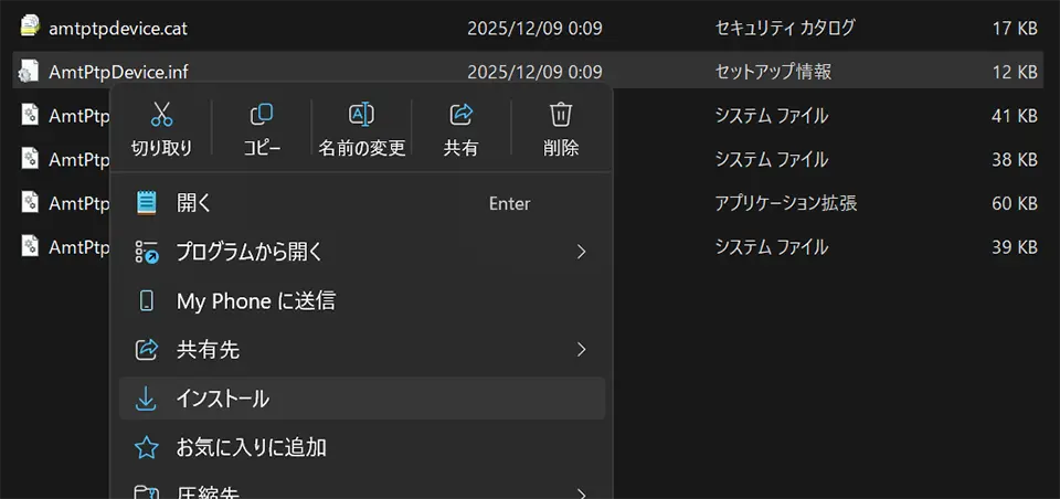 解凍したZIPファイル内の、AmtPtpDevice.infをインストールします。