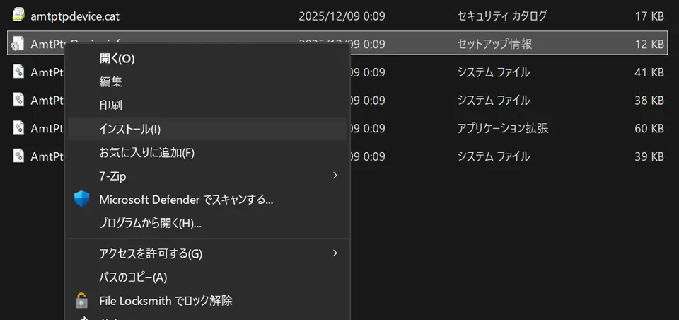 AmtPtpDevice.infを右クリックして、インストールを選んでください。