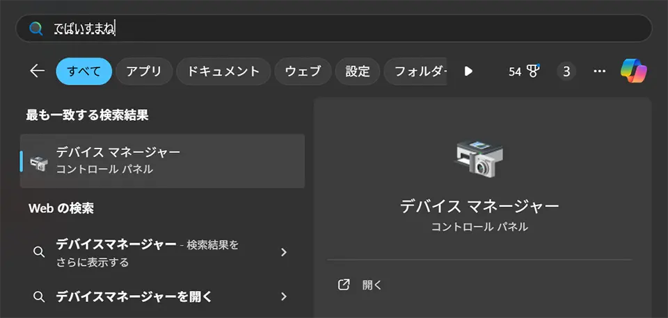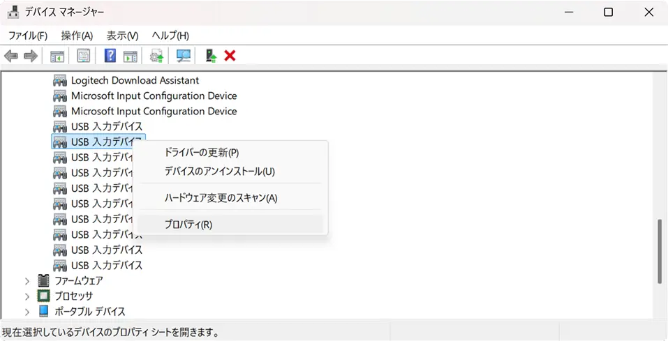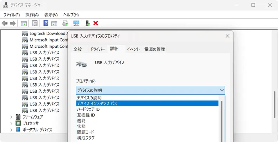 デバイス インスタンス パスの値を確認するには、デバイスをダブルクリックするか、右クリックで表示されるメニューからプロパティを選びます。