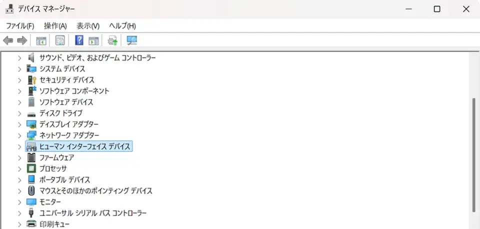 表示されたデバイスマネージャーの中から、ヒューマン インターフェイス デバイスを探して、開きます。