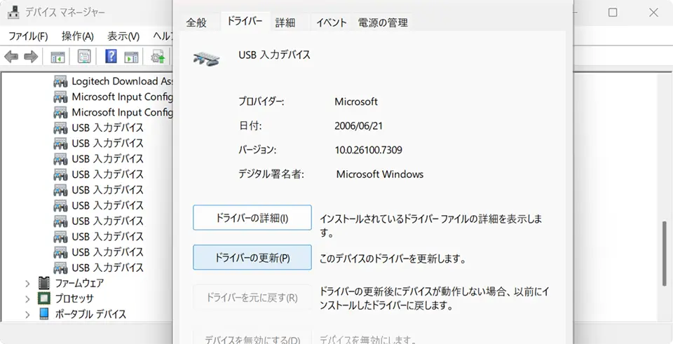 デバイス インスタンス パスの値がUSB\VID_05AC&PID_0324&MI_00\***のデバイスが見つかったら、該当デバイスのプロパティからドライバータブを開き、ドライバーの更新を選びます。
