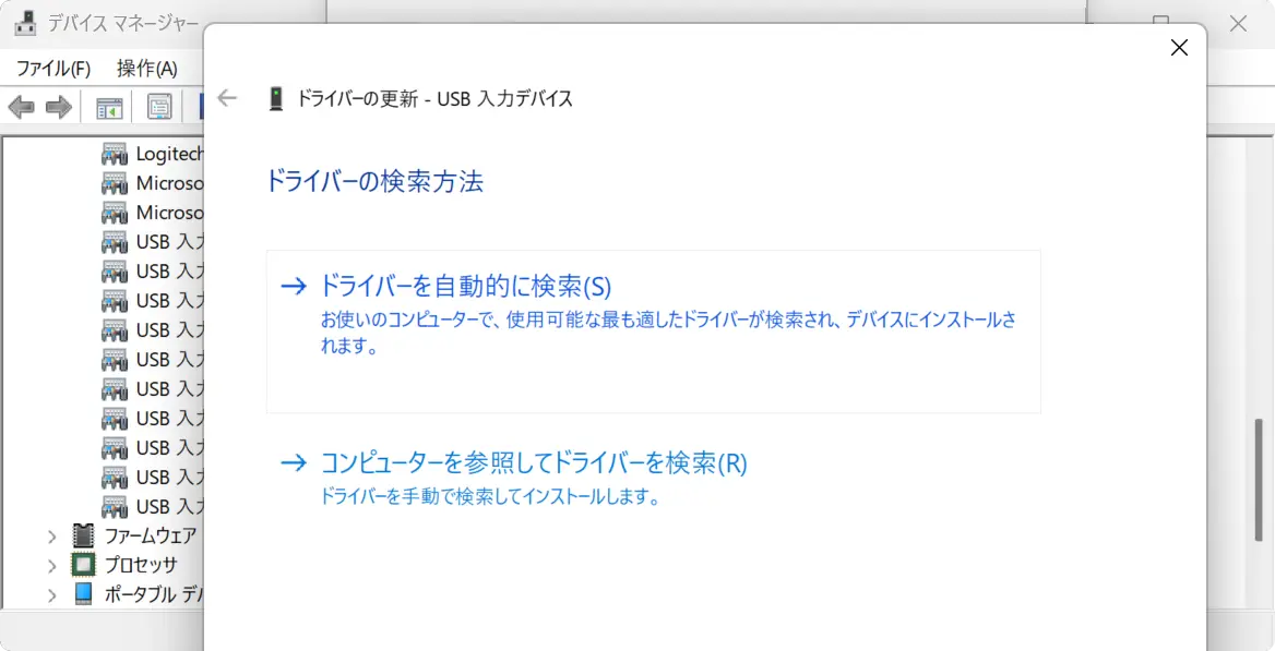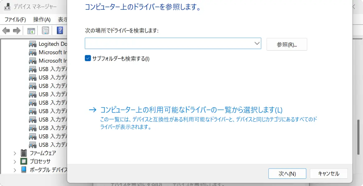 ドライバーの検索方法は、コンピューターを参照してドライバーを検索を選び、コンピュータ上の利用可能なドライバーの一覧から選択しますを選びます。