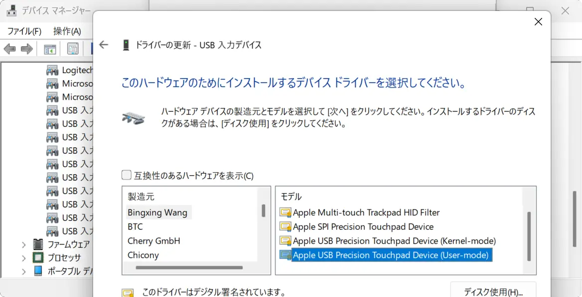 製造元からBingxing Wangを選び、モデルからApple USB Precision Touchpad Device (User-mode)を選びます。